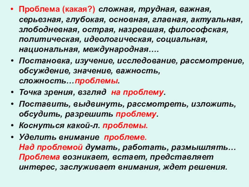 Слайд 12Проблема (какая?) сложная, трудная, важная, серьезная, глубокая, основная, главная, актуальная, злободневная,