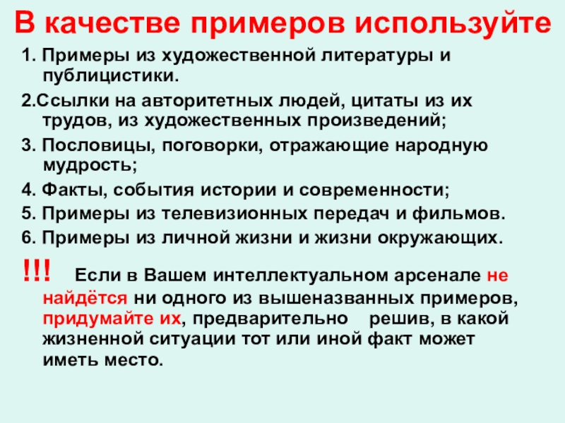 !!! Если в Вашем интеллектуальном арсенале не найдётся ни одного из вышеназванных примеров, придумайте их, предварительно решив, в какой жизненной ситуации тот или иной факт может иметь место.