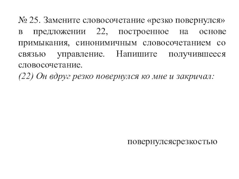 Слайд 35№ 25. Замените словосочетание «резко повернулся» в предложении 22, построенное на