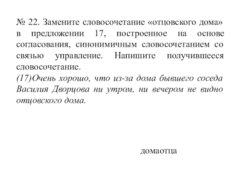 Слайд 32№ 22. Замените словосочетание «отцовского дома» в предложении 17, построенное на