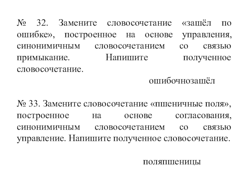Слайд 39№ 32. Замените словосочетание «зашёл по ошибке», построенное на основе управления,