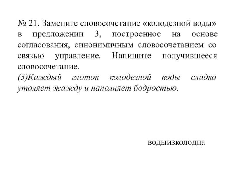 Слайд 31№ 21. Замените словосочетание «колодезной воды» в предложении 3, построенное на