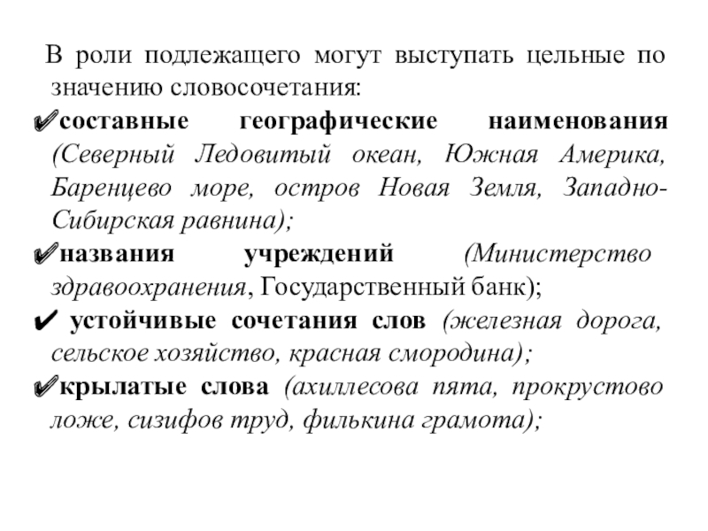 Слайд 6В роли подлежащего могут выступать цельные по значению словосочетания:
