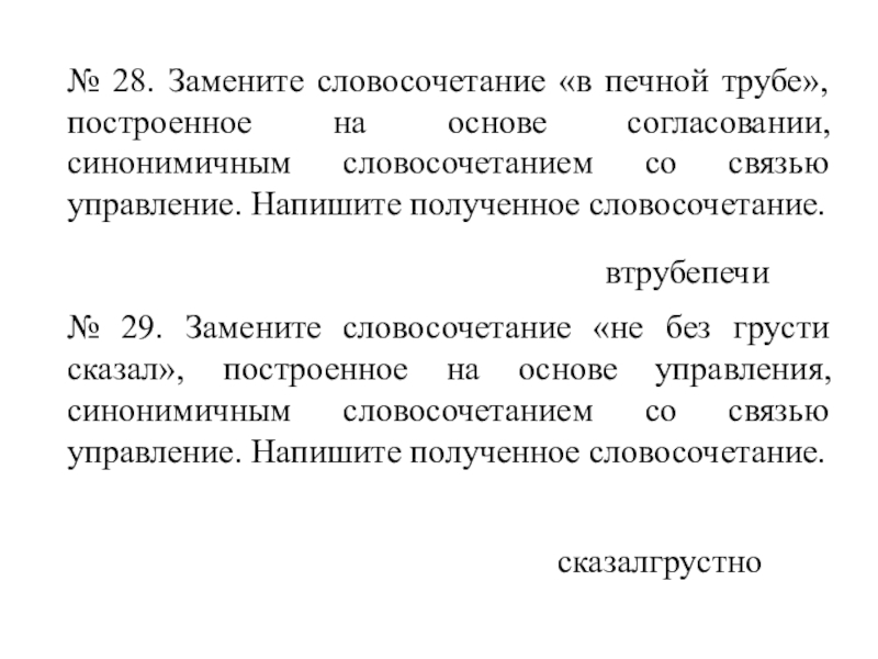 Слайд 37№ 28. Замените словосочетание «в печной трубе», построенное на основе согласовании,
