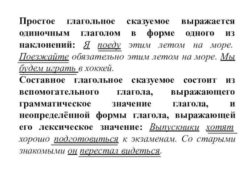 Составное глагольное сказуемое состоит из вспомогательного глагола, выражающего грамматическое значение глагола, и неопределённой формы глагола, выражающей его лексическое значение: Выпускники хотят хорошо подготовиться к экзаменам. Со старыми знакомыми он перестал видеться.