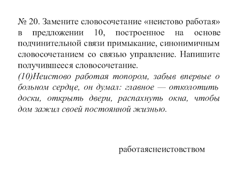 Слайд 30№ 20. Замените словосочетание «неистово работая» в предложении 10, построенное на