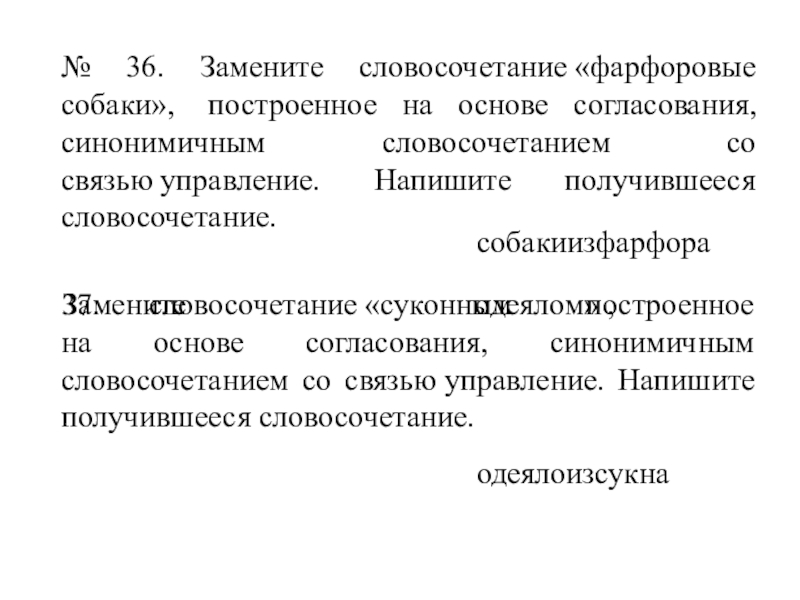 Слайд 41№ 36. Замените словосочетание «фарфоровые собаки», построенное на основе согласования, синонимичным словосочетанием