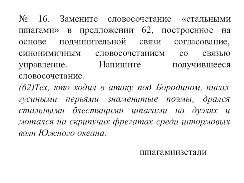 Слайд 26№ 16. Замените словосочетание «стальными шпагами» в предложении 62, построенное на
