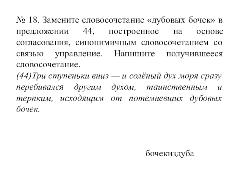 Слайд 28№ 18. Замените словосочетание «дубовых бочек» в предложении 44, построенное на