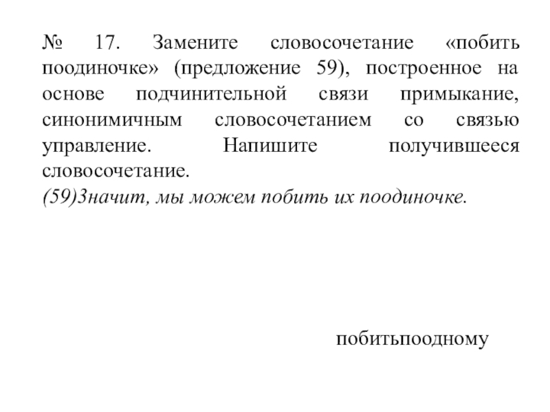 Слайд 27№ 17. Замените словосочетание «побить поодиночке» (предложение 59), построенное на основе