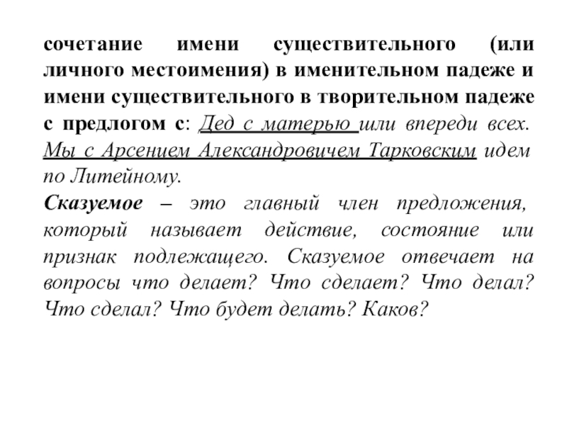 существительного в творительном падеже с предлогом с: Дед с матерью шли впереди всех. Мы с Арсением Александровичем Тарковским идем по Литейному.