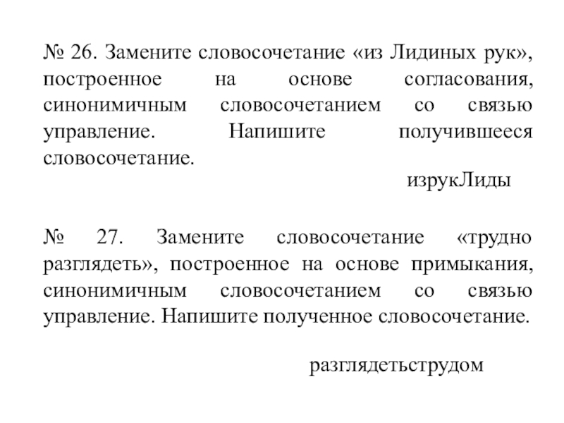Слайд 36№ 26. Замените словосочетание «из Лидиных рук», построенное на основе согласования,