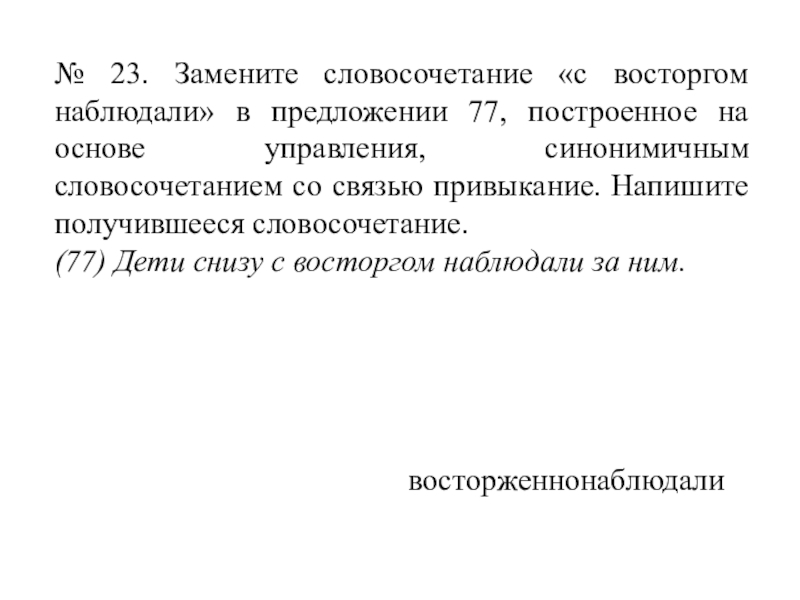 Слайд 33№ 23. Замените словосочетание «с восторгом наблюдали» в предложении 77, построенное