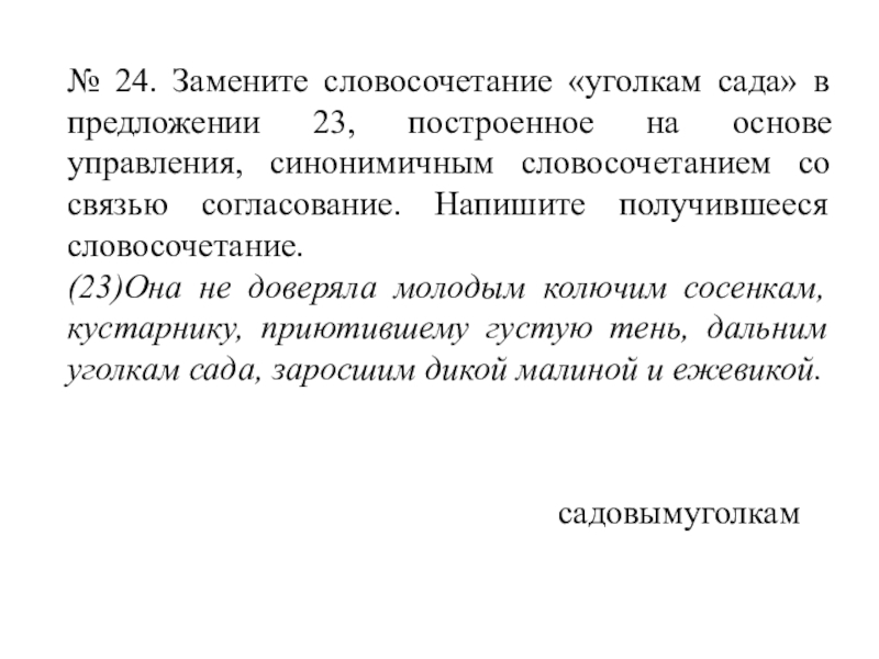 Слайд 34№ 24. Замените словосочетание «уголкам сада» в предложении 23, построенное на