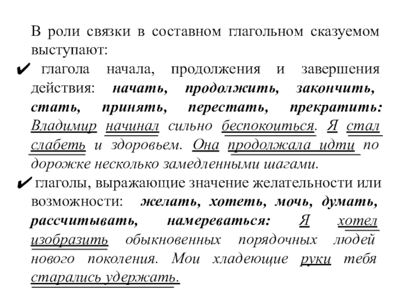 и завершения действия: начать, продолжить, закончить, стать, принять, перестать, прекратить: Владимир начинал сильно беспокоиться. Я стал слабеть и здоровьем. Она продолжала идти по дорожке несколько замедленными шагами.