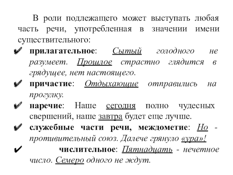 Слайд 5 В роли подлежащего может выступать любая часть речи, употребленная в
