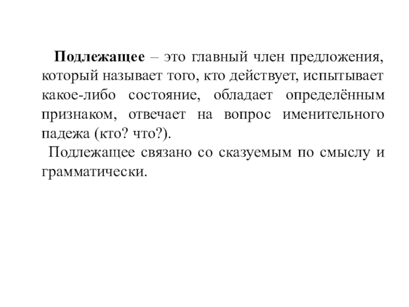 того, кто действует, испытывает какое-либо состояние, обладает определённым признаком, отвечает на вопрос именительного падежа (кто? что?).