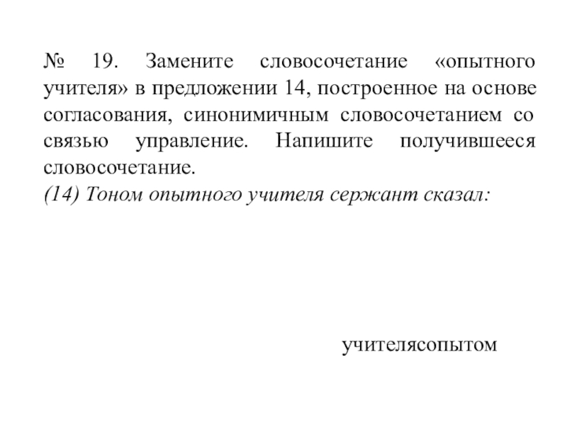 Слайд 29№ 19. Замените словосочетание «опытного учителя» в предложении 14, построенное на