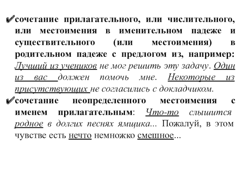 (или местоимения) в родительном падеже с предлогом из, например: Лучший из учеников не мог решить эту задачу. Один из вас должен помочь мне. Некоторые из присутствующих не согласились с докладчиком.