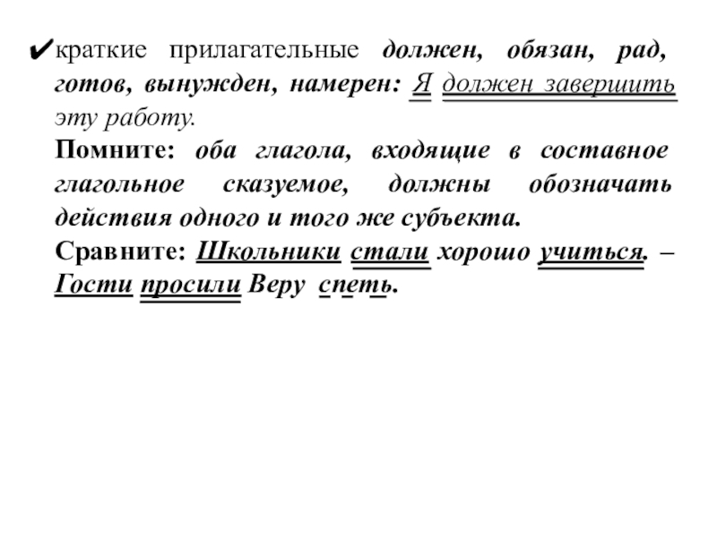 Слайд 13краткие прилагательные должен, обязан, рад, готов, вынужден, намерен: Я должен завершить