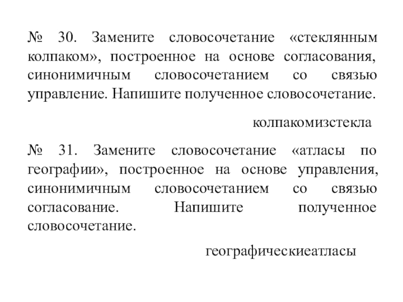 Слайд 38№ 30. Замените словосочетание «стеклянным колпаком», построенное на основе согласования, синонимичным