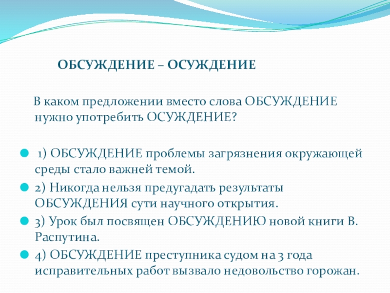 каком предложении вместо слова ОБСУЖДЕНИЕ нужно употребить ОСУЖДЕНИЕ?