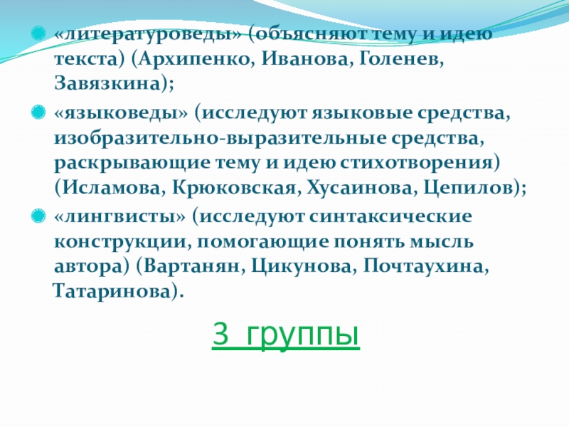 «литературоведы» (объясняют тему и идею текста) (Архипенко, Иванова, Голенев, Завязкина);