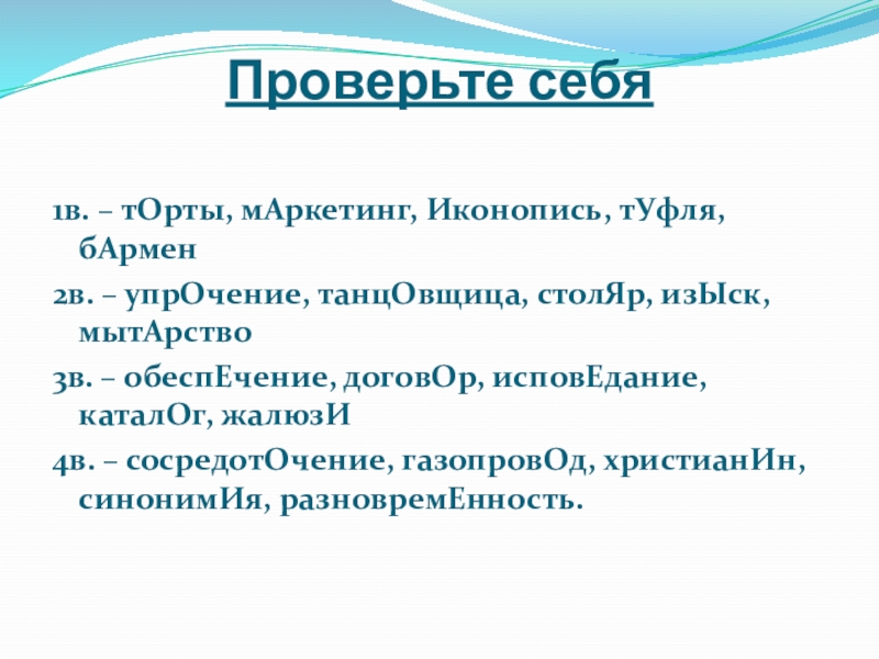 1в. – тОрты, мАркетинг, Иконопись, тУфля, бАрмен
