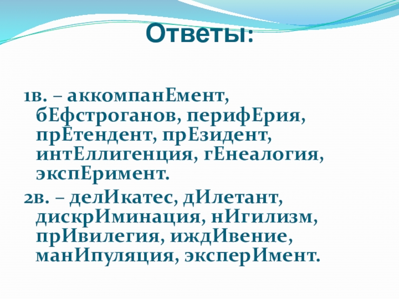 1в. – аккомпанЕмент, бЕфстроганов, перифЕрия, прЕтендент, прЕзидент, интЕллигенция, гЕнеалогия, экспЕримент.