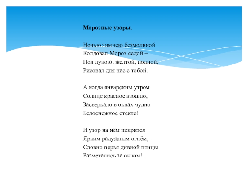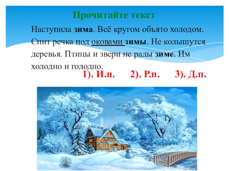 Наступила зима. Всё кругом объято холодом. Спит речка под оковами зимы. Не колышутся деревья. Птицы и звери не рады зиме. Им холодно и голодно.