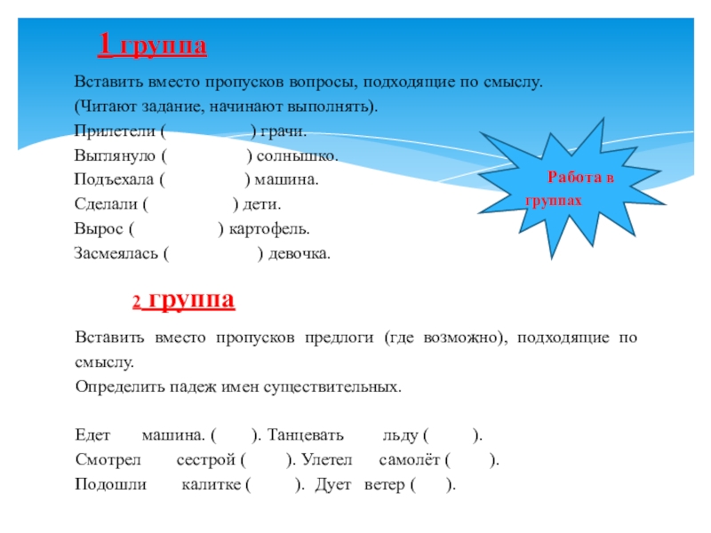 Вставить вместо пропусков вопросы, подходящие по смыслу. (Читают задание, начинают выполнять).