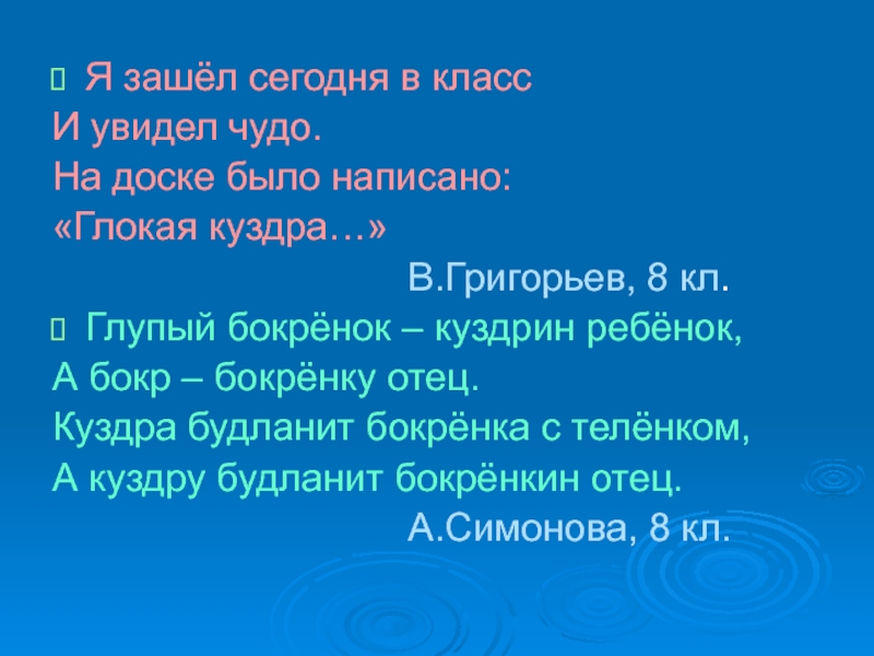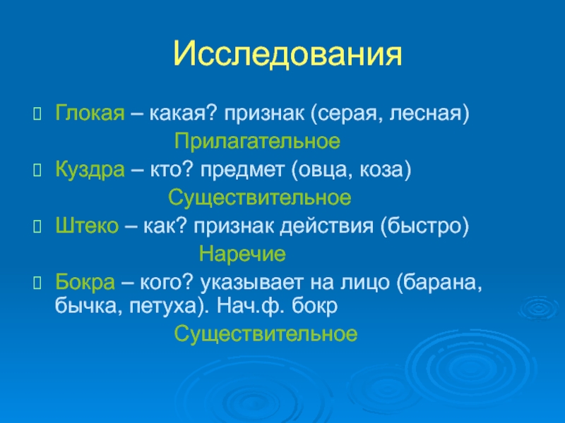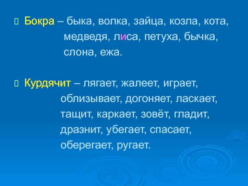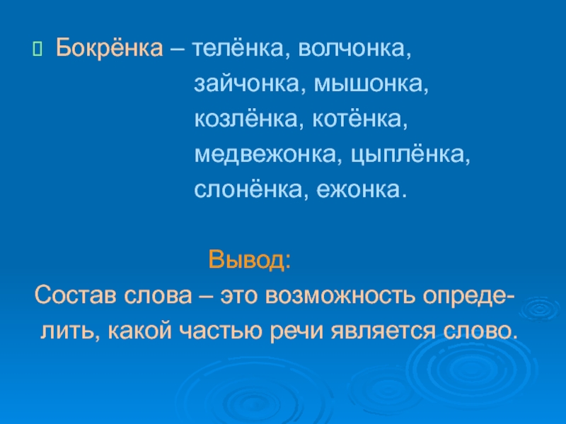 Бокрёнка – кого? предмет (детёныш) (телёнка, котёнка). Нач.ф. бокрёнок