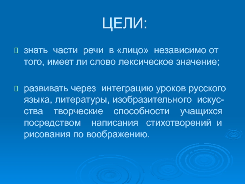 развивать через интеграцию уроков русского языка, литературы, изобразительного искус- ства творческие способности учащихся посредством написания стихотворений и рисования по воображению.