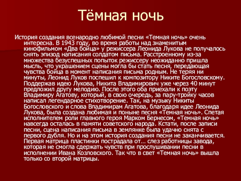 1943 году, во время работы над знаменитым кинофильмом «Два бойца» у режиссера Леонида Лукова не получалось снять эпизод написания солдатом письма. Расстроенному из-за множества безуспешных попыток режиссеру неожиданно пришла мысль, что украшением сцены могла бы стать песня, передающая чувства бойца в момент написания письма родным. Не теряя ни минуты, Леонид Луков поспешил к композитору Никите Богословскому. Поддержав идею Лукова, Никита Владимирович уже через 40 минут предложил другу мелодию. После этого оба приехали к поэту Владимиру Агатову, который, в свою очередь, за пару-тройку часов написал легендарное стихотворение. Так, на музыку Никиты Богословского и слова Владимирам Агатова, благодаря идее Леонида Лукова, была создана любимая и поныне песня «Темная ночь». Спетая исполнителем роли главного героя Марком Бернесом, «Темная ночь» навсегда осталась в памяти советского народа. Кстати, после записи песни, сцена написания письма в землянке была удачно снята с первого дубля. Но и на этом история создания песни не заканчивается. Первая матрица пластинки пострадала от… слез работницы завода, которая не смогла сдержать чувств при прослушивании песни в исполнении Ивана Козловского. Так что в свет «Темная ночь» вышла только со второй матрицы.