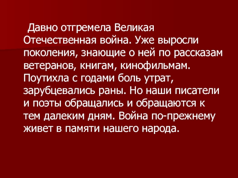 о ней по рассказам ветеранов, книгам, кинофильмам. Поутихла с годами боль утрат, зарубцевались раны. Но наши писатели и поэты обращались и обращаются к тем далеким дням. Война по-прежнему живет в памяти нашего народа.