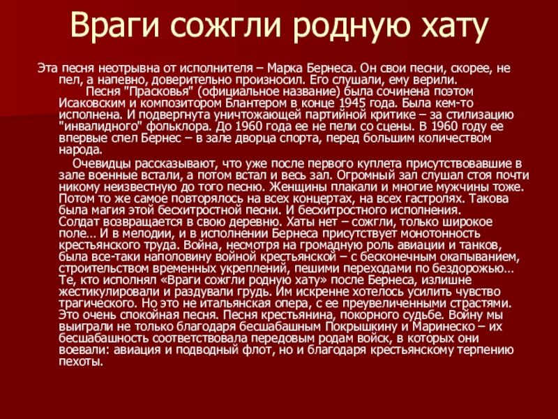 Солдат возвращается в свою деревню. Хаты нет – сожгли, только широкое поле… И в мелодии, и в исполнении Бернеса присутствует монотонность крестьянского труда. Война, несмотря на громадную роль авиации и танков, была все-таки наполовину войной крестьянской – с бесконечным окапыванием, строительством временных укреплений, пешими переходами по бездорожью… Те, кто исполнял «Враги сожгли родную хату» после Бернеса, излишне жестикулировали и раздували грудь. Им искренне хотелось усилить чувство трагического. Но это не итальянская опера, с ее преувеличенными страстями. Это очень спокойная песня. Песня крестьянина, покорного судьбе. Войну мы выиграли не только благодаря бесшабашным Покрышкину и Маринеско – их бесшабашность соответствовала передовым родам войск, в которых они воевали: авиация и подводный флот, но и благодаря крестьянскому терпению пехоты.