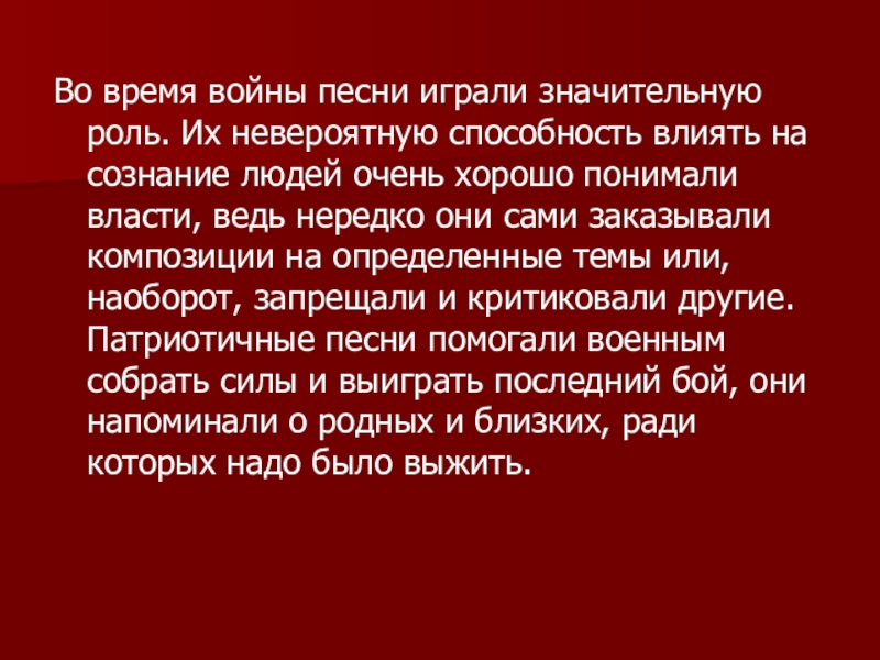 на сознание людей очень хорошо понимали власти, ведь нередко они сами заказывали композиции на определенные темы или, наоборот, запрещали и критиковали другие. Патриотичные песни помогали военным собрать силы и выиграть последний бой, они напоминали о родных и близких, ради которых надо было выжить.