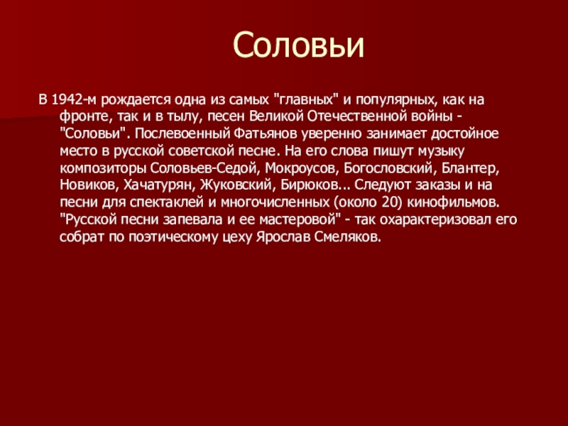 фронте, так и в тылу, песен Великой Отечественной войны - "Соловьи". Послевоенный Фатьянов уверенно занимает достойное место в русской советской песне. На его слова пишут музыку композиторы Соловьев-Седой, Мокроусов, Богословский, Блантер, Новиков, Хачатурян, Жуковский, Бирюков... Следуют заказы и на песни для спектаклей и многочисленных (около 20) кинофильмов. "Русской песни запевала и ее мастеровой" - так охарактеризовал его собрат по поэтическому цеху Ярослав Смеляков.