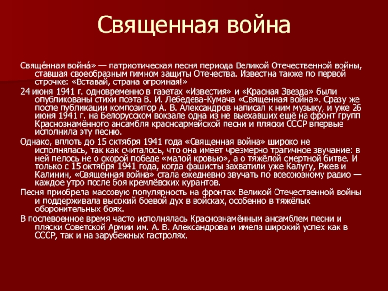 Свяще́нная война́» — патриотическая песня периода Великой Отечественной войны, ставшая