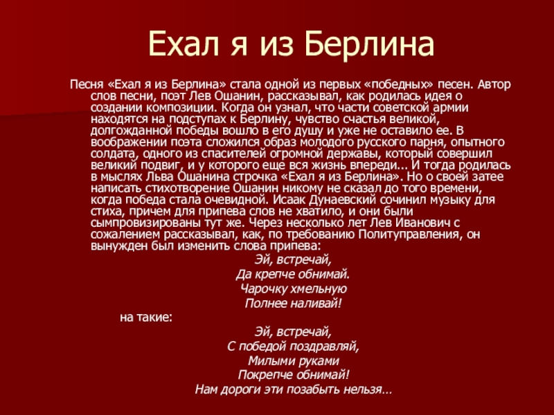 первых «победных» песен. Автор слов песни, поэт Лев Ошанин, рассказывал, как родилась идея о создании композиции. Когда он узнал, что части советской армии находятся на подступах к Берлину, чувство счастья великой, долгожданной победы вошло в его душу и уже не оставило ее. В воображении поэта сложился образ молодого русского парня, опытного солдата, одного из спасителей огромной державы, который совершил великий подвиг, и у которого еще вся жизнь впереди... И тогда родилась в мыслях Льва Ошанина строчка «Ехал я из Берлина». Но о своей затее написать стихотворение Ошанин никому не сказал до того времени, когда победа стала очевидной. Исаак Дунаевский сочинил музыку для стиха, причем для припева слов не хватило, и они были сымпровизированы тут же. Через несколько лет Лев Иванович с сожалением рассказывал, как, по требованию Политуправления, он вынужден был изменить слова припева: