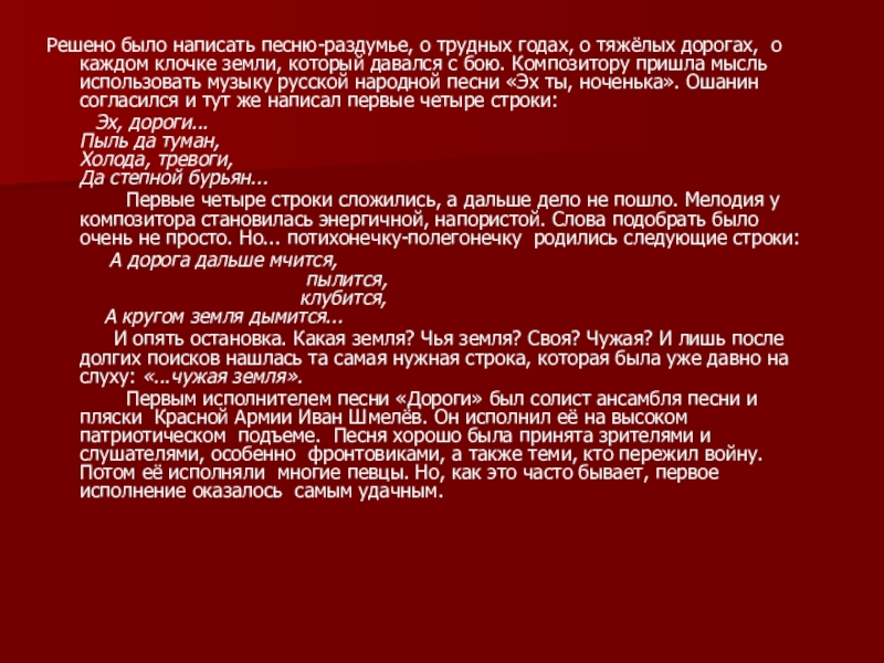 Слайд 11Решено было написать песню-раздумье, о трудных годах, о тяжёлых дорогах, о