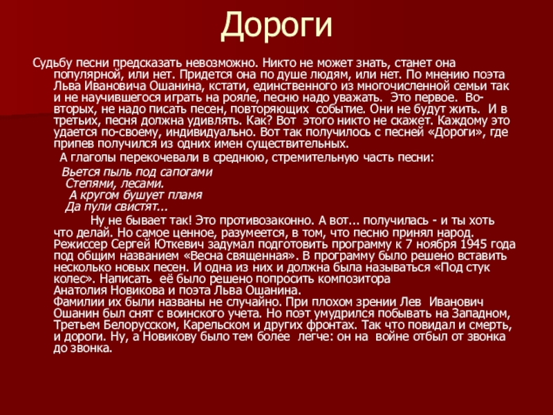 или нет. Придется она по душе людям, или нет. По мнению поэта Льва Ивановича Ошанина, кстати, единственного из многочисленной семьи так и не научившегося играть на рояле, песню надо уважать. Это первое. Во-вторых, не надо писать песен, повторяющих событие. Они не будут жить. И в третьих, песня должна удивлять. Как? Вот этого никто не скажет. Каждому это удается по-своему, индивидуально. Вот так получилось с песней «Дороги», где припев получился из одних имен существительных.