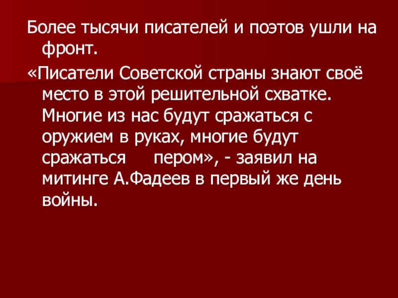 своё место в этой решительной схватке.Многие из нас будут сражаться с оружием в руках, многие будут сражаться пером», - заявил на митинге А.Фадеев в первый же день войны.