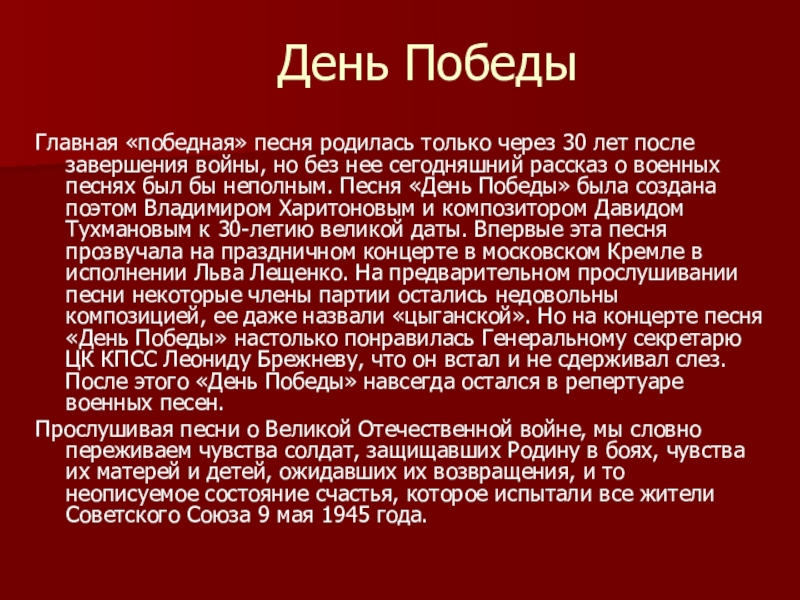 войны, но без нее сегодняшний рассказ о военных песнях был бы неполным. Песня «День Победы» была создана поэтом Владимиром Харитоновым и композитором Давидом Тухмановым к 30-летию великой даты. Впервые эта песня прозвучала на праздничном концерте в московском Кремле в исполнении Льва Лещенко. На предварительном прослушивании песни некоторые члены партии остались недовольны композицией, ее даже назвали «цыганской». Но на концерте песня «День Победы» настолько понравилась Генеральному секретарю ЦК КПСС Леониду Брежневу, что он встал и не сдерживал слез. После этого «День Победы» навсегда остался в репертуаре военных песен.