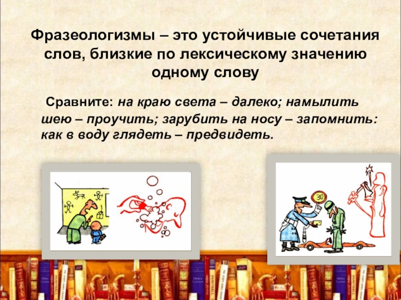 Сравните: на краю света – далеко; намылить шею – проучить; зарубить на носу – запомнить: как в воду глядеть – предвидеть.