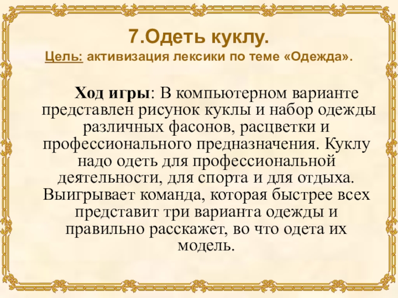 куклы и набор одежды различных фасонов, расцветки и профессионального предназначения. Куклу надо одеть для профессиональной деятельности, для спорта и для отдыха. Выигрывает команда, которая быстрее всех представит три варианта одежды и правильно расскажет, во что одета их модель.