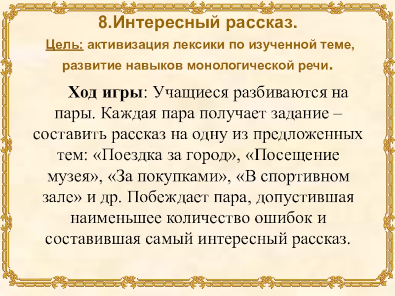 Ход игры: Учащиеся разбиваются на пары. Каждая пара получает задание – составить рассказ на одну из предложенных тем: «Поездка за город», «Посещение музея», «За покупками», «В спортивном зале» и др. Побеждает пара, допустившая наименьшее количество ошибок и составившая самый интересный рассказ.