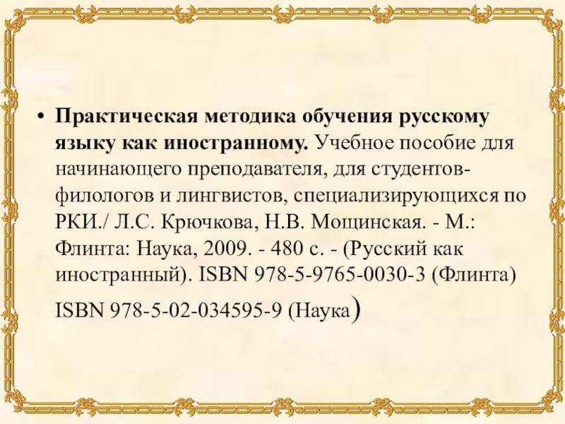 преподавателя, для студентов-филологов и лингвистов, специализирующихся по РКИ./ Л.С. Крючкова, Н.В. Мощинская. - М.: Флинта: Наука, 2009. - 480 с. - (Русский как иностранный). ISBN 978-5-9765-0030-3 (Флинта) ISBN 978-5-02-034595-9 (Наука)