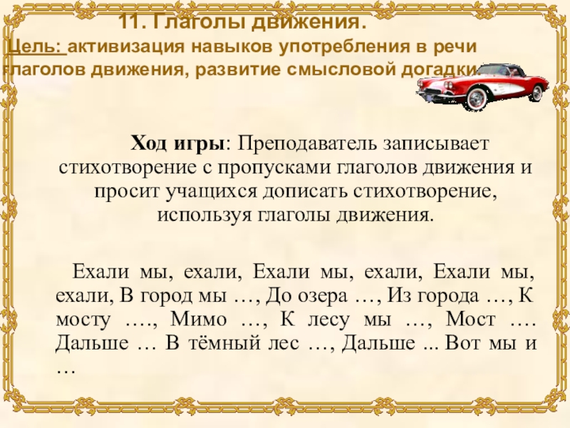 Ход игры: Преподаватель записывает стихотворение с пропусками глаголов движения и просит учащихся дописать стихотворение, используя глаголы движения.