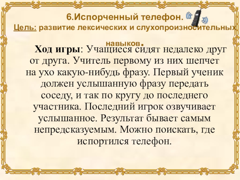 Учащиеся сидят недалеко друг от друга. Учитель первому из них шепчет на ухо какую-нибудь фразу. Первый ученик должен услышанную фразу передать соседу, и так по кругу до последнего участника. Последний игрок озвучивает услышанное. Результат бывает самым непредсказуемым. Можно поискать, где испортился телефон.